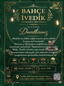 Anadolu’nun zengin mutfak kültürü, Ankara’da yeni bir adresle hayat buluyor. Erzincanlı iş insanları Cemil TANGUROĞLU ve Umut TANGUROĞLU, Anadolu’nun dört bir yanından derlenen yöresel lezzetleri başkentte vatandaşlarla buluşturacak Bahçe İvedik isimli işletmelerini açıyor. İvedik OSB Hasemek Sanayi Sitesi 1122 Cadde Yenimahalle’de hizmet verecek olan mekan, 11 Nisan’da kapılarını açacak. Açılışla birlikte, Anadolu’nun farklı bölgelerine ait geleneksel yemekler aynı çatı altında sunulacak.