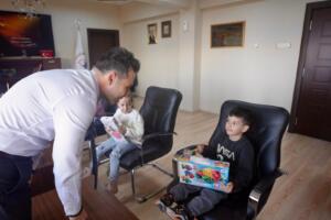Üzümlü Anaokulu öğrencileri, “Ailemle Milli Değerlere El Ele” Projesi kapsamında hazırladıkları Türk Bayrağı çalışmasını takdim etmek üzere Üzümlü Kaymakamı Buğra KARADAĞ’ı makamında ziyaret etti.